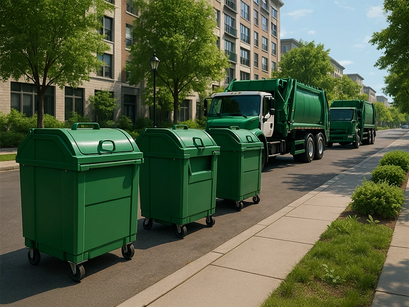 Diseño y entrega de contenedores de carga frontal para uso residencial y urbano, mejorando la recolección y manejo de residuos domésticos.